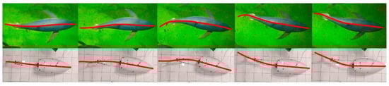 Snapshots from a video of a tuna and the robotic fish swimming. The middle line is marked in red.