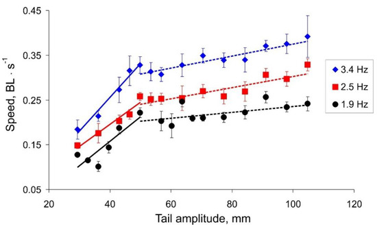 The results illustrating the dependences of the actual robot speed on the tail oscillation amplitude and frequency are presented in Figure 6. One can note that the data sets have non-monotonic shapes with a seemingly oscillatory pattern. Results for different frequencies have qualitatively similar profiles, which shifted to a higher speed as the tail beat frequency increased. We notice that all dependencies of the robot speed on the amplitude of the tail beats have two linear trends with different slopes. Results of linear regression show [0.005, 0.008] for a small amplitude value (Figure 6, solid lines) and 0.001 for a larger value (Figure 6, dashed lines). The intersection of the regression lines takes place at an amplitude of about 50 mm for all the beat frequencies.