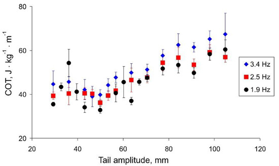 Figure 7 shows the dependence of the cost of transport on the amplitude of the tail beats. For all three frequencies, we can observe a minimum COT corresponding to the change in the angle of the regression lines in Figure 6. Summarizing the results (Figure 6 and Figure 7), we can conclude that the speed of the robot strongly depends on the amplitude of the tail beats up to a threshold value of about 50 mm. With a further increase in the amplitude, the robot can swim a little faster; however, this mode is more energy expensive.