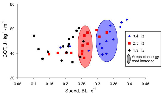 More spectacular is the presentation of the COT versus robot movement speed shown in Figure 8. For higher frequency values, there is a threshold speed, below which the swimming is efficient. The threshold speed is higher for larger frequency values (marked areas in Figure 8). Note that for lower frequencies, the movement speed is limited and does not increase with increasing COT, i.e., the oscillation amplitude (black labels in Figure 8).