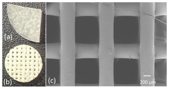 (a,b) Representative images of the samples fabricated using solvent casting and 3D bioplotting techniques, respectively, (c) a top-view image of a 3D bioplotted scaffold, as seen via SEM.