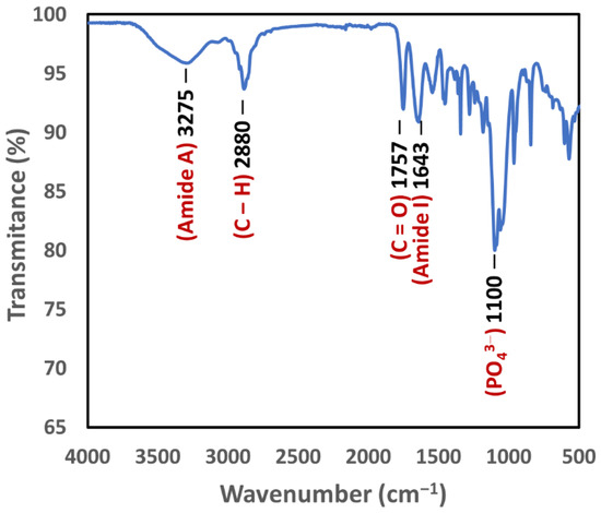 The FTIR spectrum in Figure 5 shows the presence of PLGA in the 3D bioplotted scaffolds, as evidenced by a peak at 1757 cm−1 for carbonyl group (C=O) stretching [38]. The absorption peaks of the amide I bands have been reported to be between 1630 and 1657 cm−1 [39]. Hence, the presence of collagen in the scaffolds was based on the spectral absorption at 1642 cm−1 as well as the amide A peak related to N-H stretching (3275 cm−1). Hydroxyapatite could be identified via the absorption bands at 1105 cm−1 and 1035 cm−1, which were assigned to the phosphate ions (PO43−) [40]. Furthermore, the absorption within the 2800–3000 cm−1 range (peaked at 2880 cm−1) was attributed to aliphatic C–H stretching [41].