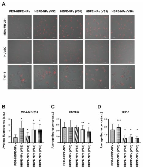 To determine whether pre-treating HBPE-NPs with VS3-6 could modulate cell uptake, MDA-MB-231, HUVEC, and THP-1 cells were incubated with VS3-6-pre-treated HBPE-NPs. The PEG-HBPE-NPs were used as controls. Each formulation of HBPE-NPs before sera treatment or PEGylation was encapsulated with DiI dye for tracking fluorescent particles in cells. All HBPE-NPs had comparable loading of encapsulated DiI; see Nierenberg et al. []. Laser confocal scanning microscopy was used to visualize particles within cells, and mid-plane images of cells were acquired. These data are not quantitative and are shown for visualization purposes. For quantitative measurements of particle uptake, a multi-modal plate reader with digital imaging capacity was used to determine total fluorescence within a population of cells. Fluorescence values were calculated by averaging the pixel intensity of individual cells.