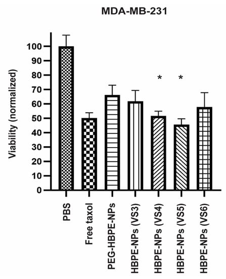 To assess if uptake of HBPE-NPs (VS3-6) by MDA-MB-231 cells correlated with enhanced delivery of cancer-killing drugs compared to PEGylated particles, HBPE-NPs were encapsulated with ~0.5–0.6 μg Taxol and subsets of particles either pre-treated with VS3-6 or PEGylated. After 24 h post-treatment, cell viability was evaluated using an MTT viability assay (Figure 3). PBS alone was used as vehicle control. Free Taxol (~50 nM/43 μg) was used as a positive control. Equivalent Taxol loading in all HBPE-NPs before sera treatment was determined using methods described in Nierenberg et al. []. While VS3-6-treated HBPE-NPs and control PEG-HBPE-NPs delivered toxic doses of Taxol, cancer cells incubated with HBPE-NPs (VS4 or VS5) demonstrated a statistically significant reduction in viability as compared to PEG-HBPE-NPs. Increased drug-mediated toxicity may be attributed to HBPE-NPs (VS4 or VS5) promoting higher NP uptake in MDA-MB-231 cells over PEG-HBPE-NPs (Figure 2B and Figure S2). HBPE-NPs (VS4 or VS5 treated) effectively delivered a dose of Taxol (~0.5 μg) that decreased the viability of breast cancer cells by ~48% and ~54%, respectively, and was ~80-fold lower than the IC50 dose of free Taxol (43 μg) that resulted in an equivalent amount of cell death. These results indicate that by absorbing macromolecules from VS4-5, drug delivery to cancer cells by HBPE-NPs was more efficient.