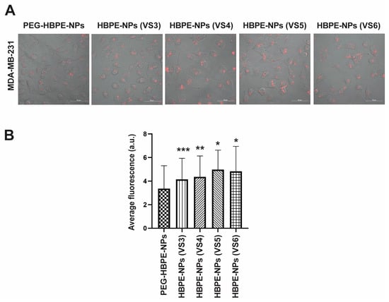 Using the modified transwell system, we ascertained if VS3-6-treated HBPE-NPs loaded with DiI dye could localize from the insert lined with endothelial cells (HUVECs) to the bottom chamber seeded with breast cancer cells. PEG-HBPE-NPs were used as a standard control. We added 0.1 mg HBPE-NPs (VS3-6-treated) or PEG-HBPE-NPs to the insert with HUVECs and placed the insert in the bottom plate containing MDA-MB-231 cells for 24 h before measuring uptake of HBPE-NPs by MDA-MB-231 cells. The uptake of DiI-loaded sera-treated HBPE-NPs and PEG-HBPE-NPs by cancer cells was visualized by confocal microscopy (Figure 4A) and quantitated by digital microscopy (Figure 4B and Figure S4). Note that the 0.1 mg dose of HBPE-NPs for the transwell experiments was optimized in Nierenberg et al. []. Uptake by MDA-MB-231 cells of HBPE-NPs (VS5-treated) and HBPE-NPs (VS6-treated) was significantly higher (p < 0.0001) than PEG-HBPE-NPs by ~48.6% and ~44.2%, respectively, indicating improved cancer cell uptake of HBPE-NPs, even after prior exposure to endothelial cells. Recall that in the direct uptake experiments with MDA-MB-231 cells, we found that HBPE-NPs (VS3-6) demonstrated higher uptake than PEG-HBPE-NPs (Figure 2B). This did not change in the two-chamber transwell studies in which HBPE-NPs pre-treated with VS3-6 were initially exposed to HUVECs (Figure 4A,B). Hence, we concluded that the movement of HBPE-NPs, pre-treated with VS3-6, from the insert into the bottom plate to be taken up by cancer cells was not impaired by the initial contact of HBPE-NPs with endothelial cells and is an area for future optimization to improve the transcytosis of systemically introduced HBPE-NPs.
