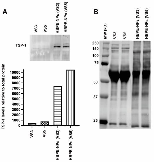 When comparing the analysis of proteins in the coronas of HBPE-NPs (VS3-treated and VS5-treated), we identified proteins that could bind to single or multiple ligand/receptor classes. The enhanced cancer cell uptake of HBPE-NPs (VS5) might partly result from absorbing proteins with multiple cancer receptor-binding properties. Examples of abundant multi-cancer-target proteins absorbed by HBPE-NPs (VS5) included pregnancy zone protein, ceruloplasmin, and TSP-1. Ceruloplasmin’s affinity for copper and iron may allow it to directly bind MDA-MB-231 cells through their copper and iron transporters, such as copper transporter 1 (Ctr1) and ferroportin, respectively [,]. Ceruloplasmin could indirectly interact with cancer cells through a shared affinity with albumin for myeloperoxidase, followed by albumin binding FcRn receptors on cancer cells [,,]. TSP-1 is known to bind integrins, Low Density Lipoprotein Receptor Related Protein-1 (LRP1), EGFR, TGF-beta, urokinase-type Plasminogen Activator (uPA), and VEGF-A, all of which are expressed on, or bind to, cancer cells (GEMICCL). To assess potential HBPE-NP coronal components that enhance cancer interaction, TSP-1 was chosen as an example of a multi-target protein for further validation of its presence in the protein corona of HBPE-NPs (VS5). While only a few studies found that protein coronas of polymeric NPs were enriched with TSP-1 [,,], in one report, TSP-1 was detected in the protein corona of nanogels that featured a more hydrophobic surface []. In our study, immunoblot analysis confirmed that TSP-1 was present on HBPE-NPs (VS5).