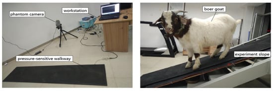 The experiment was conducted in the Biomechanics Laboratory of Jilin University. The experimental equipment comprised a slope (self-built, with a size of 2.5 × 1.4 m), of which the slope angle could be adjusted manually and increased linearly from 10° to 30° at intervals of 10°. We took pictures and videos of the slope region with a Phantom high-speed camera and evaluated the motion data of the plantar markers of forelimbs and hindlimbs using a Phantom camera control system at a sampling frequency of 20 Hz. To gather kinetic GRF data on the slope system, a 2096 × 469 mm PSW in which a 7.62 × 5.08 mm sensor was implanted with a sampling frequency of 120 Hz was put in the middle of the slope (in Figure 1). The PSW was synchronized with the motion capture system after being balanced, calibrated, and synchronized according to the manufacturer’s specifications.