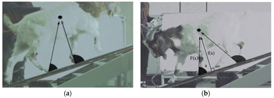 The supporting forelimbs and hindlimbs of the goat produce a propulsive force when it walks on a slope, which was utilized to measure changes in the angle between the propulsive force vector and the slope. We defined the propulsive force as the force generated by the feet of forelimbs and hindlimbs in the direction along COM. As illustrated in Figure 2, the sole and COM are manually linked as the propulsive force vector by phantom high-speed camera processing software for the camera video data taken while walking. We drew on Lee’s estimation of dog COM under the slope condition for the COM estimation, locking the COM position between the shoulder and hip [37]. By observing the reaction loads on the support surfaces of the forelimbs and hindlimbs when resting on the slope, it was noted that the forelimbs support 60.3% of its weight, and the hindlimbs support 39.7%. Therefore, we simplified the data that forelimbs account for about 60%, and hindlimbs account for 40%. The COM position should be at 40% of the trunk, biased toward the forelimbs. The angle change between the left forelimb and the right hindlimb was investigated in this research because there is no difference between the paired limbs of the goat [24]. The propulsive force can be expressed as the following equation: