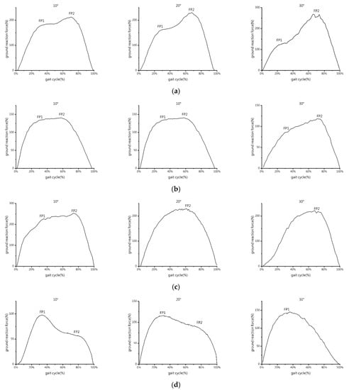As shown in Figure 3, the GRF-time curve of the forelimb displayed two local maxima during uphill, and the FP1 is smaller than the FP2 at any slope angle. With an increase in slope angle, the FP1 lowers, and the FP2 rises. When the slope angle is 10°, the GRF-time curves of the FP1 and FP2 of the hindlimb are comparable. The FP1 is greater than the FP2, and both reach their maximum values when the slope angle is 20°. At a slope angle of 30°, the FP1 is smaller than the FP2, and both are at their lowest. With an increase in slope angle, the location of the FP1 of the forelimb gradually moves from 30% to 20%, whereas the FP2 essentially stabilizes at 70%. The position of the FP2 of the hindlimb moves from 60% to 75%, and the FP1 essentially stabilizes at 30%.