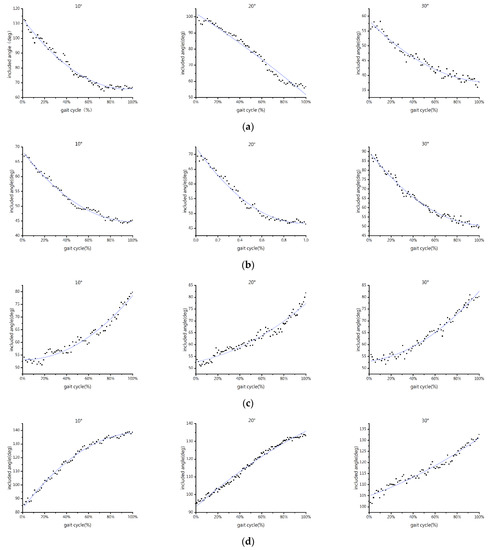 Included angle-time point plots of different limbs of the goat under different slope conditions: (a) forelimb, uphill; (b) hindlimb, uphill; (c) forelimb, downhill; and (d) hindlimb, downhill. The blue line is the second-order fitting to describe the point tendency.
