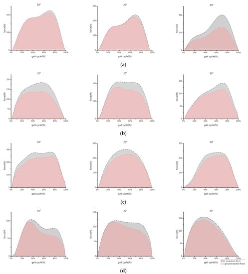 Impulse areas of different limbs of the goat under different slope conditions: (a) forelimb, uphill; (b) hindlimb, uphill; (c) forelimb, downhill; and (d) hindlimb, downhill. Red indicates the impulse of the GRF, and gray refers to the impulse of the propulsive force.