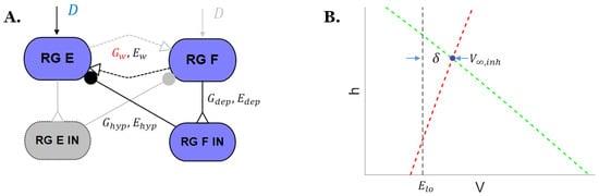 (A) Schematic of the detailed neural connections for the inhibited rhythm generator extensor neuron in Figure 1b. (B) in the phase space of the rhythm generator. The red dashed line is the V-nullcline and the green dashed line is the h-nullcline.