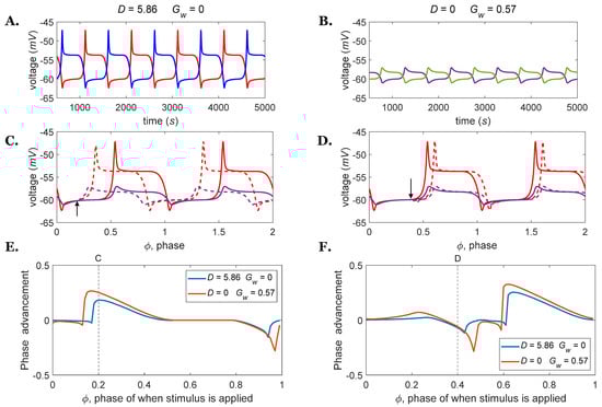 (A) Rhythm generators oscillating at 1 Hz driven by a descending drive, 𝐷 = 5.86. (B) Rhythm generators oscillating at 1 Hz driven by weak excitatory connections, = 0.57. (C,D) Comparisons between perturbed (dashed lines) and nominal (solid lines) membrane voltages for rhythm generator extensors are shown in A (red lines) and B (purple lines); (C) the inhibitory perturbation current Is = 0.5 nA was applied to the RG flexor interneuron at = 0.2 with a duration of 5 percent of the oscillation period (arrow); (D) the excitatory perturbation current Is = 0.5 nA was applied to the RG flexor interneuron at = 0.4 with a duration of 5 percent of the oscillation period (arrow). (E) PRCs for the rhythm generator driven by = 5.86 or = 0.57 at 1 Hz when perturbed by inhibitory stimuli of the same magnitude and duration as shown in part (C). (F) PRCs for the rhythm generator driven by = 5.86 or = 0.57 at 1 Hz when perturbed by excitatory stimuli of the same magnitude and duration as shown in part (D).