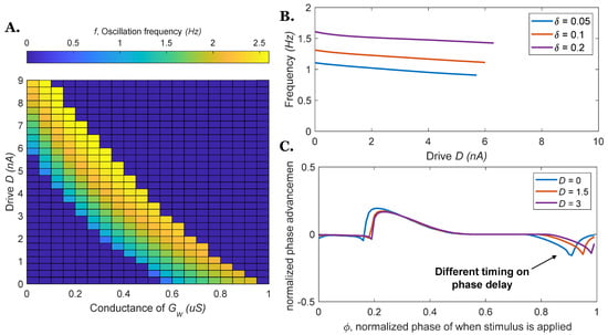 There are further differences in circuit function on the bifurcation parameter between changing the strength of the descending drive or the weak excitatory connections. For the rhythm generator driven by constant drive equals 0.07, whereas, for the network oscillating by mutual excitation , the value is 0.03. As represents the sensitivity to phase advancement/delay, it tells us how close the system’s equilibrium state is to the threshold needed to disrupt the equilibrium (and thus start another cycle). For a small , the CPG responds immediately to the inputs, and the phase advancement is directly related to when the stimulus current is applied. However, for larger values of , the rhythm generator’s sensitivity to inputs is reduced [29].