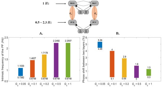 When an excitatory synapse (Gc in Figure 1 and Figure 5) connects the rhythm generator (RG) to the pattern formation (PF) layer, the PF layer can become phase locked to the RG layer even when the intrinsic frequency of the PF layer is different than that of the RG layer (Figure 5A). For example, when Gc = 0.05 uS, PF layers with intrinsic frequencies ranging from 0.73 to 1.1 Hz can be phase locked to an RG that has an intrinsic frequency of 1 Hz. When the connection strength Gc is increased, PF layers with a wider range of intrinsic frequencies can become entrained and phase locked to the RG’s frequency. Additionally, different intrinsic frequencies of the PF network result in different phase shifts between the two layers, even when there are no perturbations to the system (Figure 5B). For example, when Gc = 0.1 uS, the phase shift between the two layers ranges from 0.1% to 4%. In contrast to the trends seen in the frequency range, the range of phase difference between the two layers is reduced when the Gc connection strength increases. However, when the connection strength is too weak (Gc = 0.05), the system is less likely to phase lock, and therefore, the range of phase differences is also reduced.