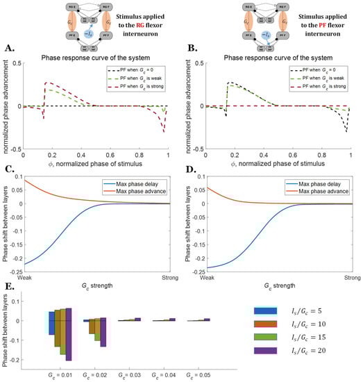 PRCs of the two-layer CPGs when perturbed with the stimulus of different magnitudes or at different phases. (A) PRCs of the two-layer CPG when the inhibitory stimulus is applied to the RG flexor interneuron. (B) PRCs of the two-layer CPG when the inhibitory stimulus is applied to the PF flexor interneuron. (C) Maximum possible phase shifts between the two layers when the stimulus is applied to the RG layer. (D) Maximum possible phase shifts between the two layers when the stimulus is applied to the PF layer. (E) Range of possible phase shifts between the two layers for different ratios when the stimulus is applied to the RG layer.