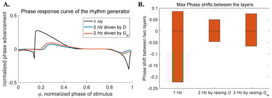 PRCs and maximum phase shift for the rhythm generator as frequency increases. (A) PRCs for the rhythm generator at 2 Hz driven by or neuromodulation of . (B) Range of phase shift between the two layers when oscillation frequency is increased.
