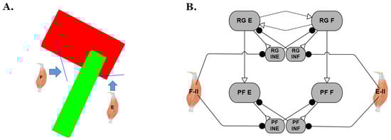 To inspect how the simulated models’ reactions to perturbation are influenced by different two-layer CPG designs, the hip joint control network from the previous synthetic nervous system (SNS) was isolated, as shown in Figure 1B. In this network, extensor and flexor Ia feedback, which signals the rate of a stretch of the muscle, synapse onto the Ia interneurons. The flexor and extensor Ib feedback, which signals the tension developed in the muscle, synapses onto the corresponding motoneurons. To eliminate other influences and simplify the problem for this study, only type II feedback was applied directly to the two-layer CPG to coordinate the extensor-flexor timing. This is similar to how increased stretching of hip flexors encourages the initiation of swing in animals, and increased stretching of extensors encourages the initiation of stance [33,34,35].