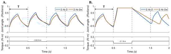 Hip joint angles vs. time during stepping with an external perturbation torque applied to the joint during ‘air-walking’ in which the leg does not touch the ground. The torque is applied on the femur at the start of the second stance phase at 0.5 s and ends at 1 s, with a duration of one step cycle. The blue 2 Hz D line indicates that the CPG is operating at 2 Hz and driven by the direct stimulus . The red 2 Hz Gw line indicates that the CPG is operating at 2 Hz by neuromodulation of the weak excitatory synapse conductivity . Dashed lines indicate when the transition from extension to flexion would occur if there was no perturbation. (A) Given a small torque perturbation (−0.02 Nm), both models recover after the perturbation ends. (B) A large torque perturbation (−0.1 Nm) causes the deletion of an entire step cycle.