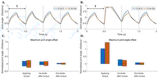 Hip joint angle vs. time during stepping with an external torque applied to the joint during ground walking. The blue 2 Hz D line indicates that the CPG is operating at 2 Hz and driven by the direct stimulus . The red 2 Hz Gw line indicates that the CPG is operating at 2 Hz by neuromodulation of the weak excitatory synapse conductivity . The torque is applied on the left femur at the start of the second stance phase with a duration of one step cycle. Dashed lines indicate when the transition from extension to flexion would occur if there was no perturbation. (A) Small torque perturbation (−0.02 Nm) as in Figure 9A. (B) Large torque perturbation (−0.1 Nm) as in Figure 9B. (C) Bars present the range of joint offset from the nominal profile during and after applying a small external torque as in (A). (D) Bars present the range of joint offset from the nominal profile during and after applying a large external torque as in (B).