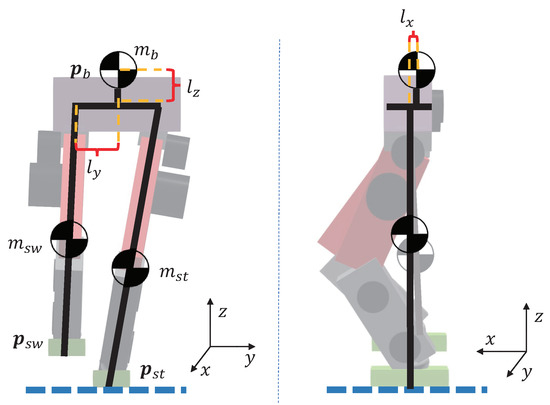Let , be the center of mass position of the stance leg and the swing leg, respectively. To simplify the model, we assume that each leg’s center of mass lies on the midpoint of the hip and foot, which means