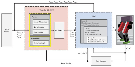 Model predictive control repeatedly solves a finite-horizon optimal control problem starting from the system’s current states [22]. Moreover, the MPC can prepare for future motions in advance. Therefore, it is very suitable for highly dynamic motion control of legged robots. Li et al. applied a single rigid body model predictive control to a biped robot with light legs [23]. The MPC generates optimal contact forces and torques at each foot, which are converted to joint torque commands through contact Jacobians. Their method enables the robot to walk at a speed of 1.6 m/s on complex terrains and achieve a wide range of dynamic motions. Luo et al. proposed a three-mass model predictive control method for gait control of biped robots [24]. Their planar three-mass model considers the robot’s ZMP and angular momentum. The swing leg trajectories are generated by heuristics rather than the MPC. Therefore, their method did not utilize the swing leg to balance the robot.