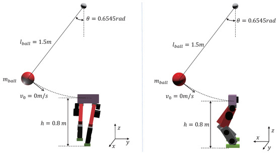 As shown in Figure 3, the biped robot stands on a single leg, and a rigid hanging ball swings down to hit the robot. The suspension point of the ball is vertically above the robot. The ball is released from the same height and angle with zero initial speed. The robot’s torso is hit 0.8 m above the ground in the frontal or the side direction. The initial height of the robot’s CoM is 0.604 m. Therefore, the hit will exert a net torque concerning the robot’s CoM. By increasing the rigid ball’s mass, the impulse received by the robot at the instance of impact increases, meaning larger external disturbance. We compare our control scheme with the WBC-only control scheme in each experiment. For both control schemes, the WBC part is the same. For the WBC-only scheme, the desired torso and leg trajectories remain equal to their initial values.