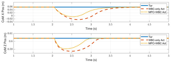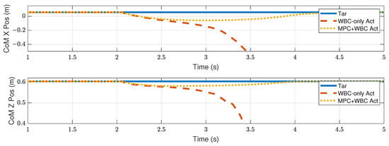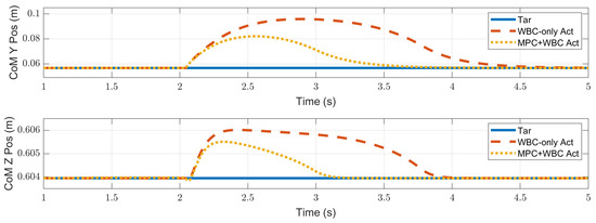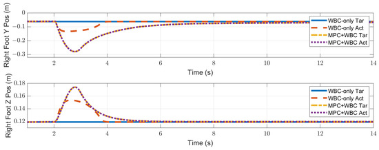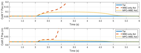 In the WBC, the centroidal dynamics task is considered the second-priority task. Due to its existence, the biped robot can mobilize all joints to maintain the position and velocity of the CoM. Therefore, the WBC-only controller has a certain degree of anti-interference ability. However, it may fail to deal with a considerable impact. The centroidal dynamics task is expressed on the acceleration level. When the acceleration required to achieve the second-priority tasks has been satisfied, the third-priority tasks will be executed as much as possible. That is to say, the WBC will execute the task of swing foot to some extent, even if the robot’s CoM has not returned to its initial state. In the WBC-only control scheme, the desired trajectory of the swing foot only keeps the initial state unchanged, which is almost unhelpful for maintaining the stability of the CoM. On the contrary, in our control scheme, the TP-MPC provides the swing foot with the desired motion trajectory that can balance the position of the CoM. The task of swing foot is almost consistent with the centroidal dynamics task in WBC. Therefore, the control scheme with TP-MPC shows a better ability to maintain the stability of the center of mass.