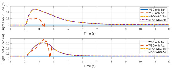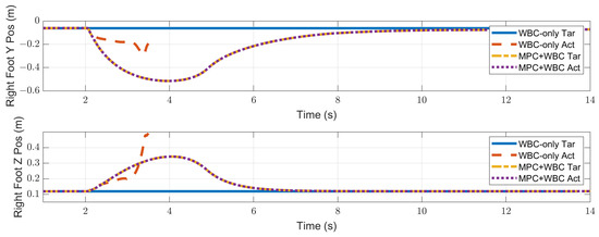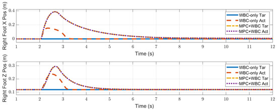 In the frontal impact experiment, the rigid ball swings along the x-axis and hits the center of the torso’s front surface. When the mass of the rigid ball is 9 kg or 11 kg, the robot’s CoM trajectories during the impact and recovery stages are shown in Figure 4 and Figure 5, respectively. In the 9 kg case, both control schemes can resist the external disturbance and bring the robot’s CoM back to its initial position, but our MPC-WBC scheme achieves smaller CoM motions and faster recovery than the WBC-only scheme. For both control schemes, Figure 6 and Figure 7 show the actual trajectories of the swing leg’s foot end and the correspondent reference trajectories given to WBC. For the WBC-only scheme, the WBC’s reference trajectories are constant, while the actual trajectories deviate significantly from the reference. This deviation results from the WBC sacrificing the foot-end tracking task for the high-priority CoM tracking task. For our MPC-WBC scheme, the reference foot end trajectories provided by the MPC and the actual trajectories almost coincide with each other. This suggests that the MPC generates swing foot trajectories that are coherent with the CoM tracking targets. It is also observed that the MPC-WBC scheme generates larger swing foot motions than the WBC-only scheme, which confirms the swing leg’s vital role in balancing the robot.