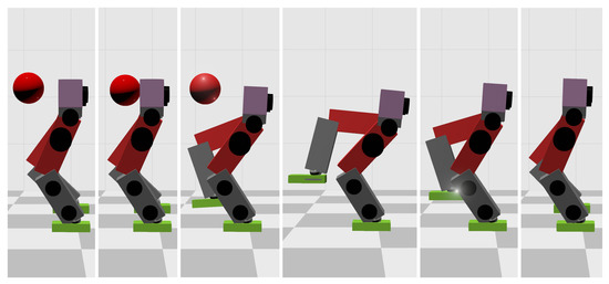 When the ball’s mass increases to 11 kg, the WBC-only scheme causes the divergence of the robot’s CoM trajectories and thus the failure of the entire robot. However, our MPC-WBC scheme can still withstand the impact. Screenshots in Figure 8 depict the robot’s motions during the impact and recovery process under our MPC-WBC scheme. Significant forward and upward motions of the swing leg can be observed after the impact, implying that our method successfully utilizes the swing leg motions to balance the robot.