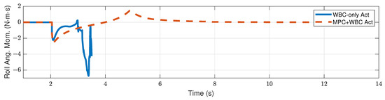 Centroidal roll angular momentum of the robot under the side impact of a 2.7 kg rigid ball.