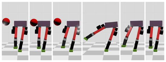Simplified models have been widely used in the balance control of bipedal robots. For example, Vukobratovic et al. first proposed the zero moment point (ZMP) concept and applied it to balance a bipedal robot [16]. Next, Kajita et al. proposed the LIP model, which simplifies the biped robot into a single mass point moving horizontally and connected to the ground by a massless retractable stick [17]. Finally, Pratt et al. extended the LIP model to a Linear Flywheel Inverted Pendulum Model, which takes the robot’s angular momentum into account [18]. Their method can resist a large external disturbance by computing the robot’s Capture Point and Capture Region. Li et al. used the momentum to control the balance of a biped robot, and they found that linear momentum was more critical than angular momentum in the balance control task. When the two momentum tasks cannot be satisfied simultaneously due to a significant disturbance, the linear momentum will be given priority [19].