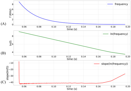 Transient of the oscillator’s frequency in a typical synaptic event. The circuit activates at 50 ms with = 100 mV, = 280 mV, and maximum synaptic efficacy. (A) Frequency plot of the oscillator’s output; (B) natural logarithm of the frequency plot in (A); (C) the slope of the plot in (B). Plots (B) and (C) show that the oscillator’s frequency decays exponentially in a typical synaptic event. The exponential dependence is lost when M11 comes out of the saturation region (Vsyn < 4 UT).