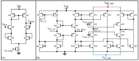 Implementing of a conductance-based synapse circuit requires a resistor-like circuit to incorporate the effect of the postsynaptic membrane potential on the synaptic current. In a few neuromorphic chips, the resistor-like circuit is implemented either using a transconductance amplifier [21,22,23] or switched-capacitor circuits [24,25]. However, these circuits operate in the above-threshold domain (of the metal oxide semiconductor (MOS) transistor), and thus consume a relatively high amount of power. In the subthreshold domain (of the MOS transistor), a low-power synapse circuit partially incorporates the desired effect of the postsynaptic membrane potential by using a transconductance-like circuit at the output stage of a differential pair integrator (DPI) synapse [26]. However, this implementation is not biologically plausible because the circuit does not implement a resistor-like element, and thus cannot reverse the polarity of the induced synaptic current necessary to replicate shunting inhibition. In [27], a subthreshold transconductance circuit was used to implement the resistor-like element. However, because of fabrication mismatch, it induced a high leakage current (static current when the circuit is inactive) into the post-synaptic node that disturbs the spiking dynamics of the soma circuit. Compensation for this leakage current required additional circuits that increase the overall power consumption of the neuron.