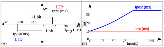 Adaptive spike-timing-dependent plasticity (STDP) learning. (A) Rectangular STDP learning rule; (B) adaptation of tpost in rectangular STDP learning rule during the learning process.