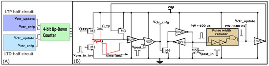 where is the maximum delay of the postsynaptic spike after the presynaptic spike leading to potentiation (LTP). is the maximum delay of the presynaptic spike after the postsynaptic spike leading to depression (LTD); and represent the timing of the pre- and postsynaptic spikes, respectively. The efficacy saturates at its maximum () and minimum () values. The learning parameter is kept constant during learning and is increased, as shown in Figure 7B. The details of the adaptive STDP learning are provided in a previous study [29]. Each synapse circuit has a learning circuit to implement the adaptive STDP learning. A block diagram is shown in Figure 8A. The synaptic efficacy is stored in a four-bit up-down counter and updated by the circuits controlling its LTP and LTD. A conceptual schematic of the half-circuit controlling the LTP of the synaptic efficacy is shown in Figure 8B. The details of the circuit operation are provided in another study [30]. The value of (which controls) was fixed at 780 mV. The initial value of (that controls) was fixed at 783 mV and was adapted to higher values during learning (as shown in Figure 7B). The chip does not contain an adaptation circuitry, and the adaptation of was controlled via an external voltage source.