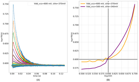 In the proposed circuit, only is a constant-voltage source (600 mV). The node is not a voltage source. The current sourced and sunk by the inverters (INV1–4) and M12 determine its voltage. The propagation time () of the inverters (which controls the oscillator’s frequency and pulse width) is thus not constant, and the frequency has an exponential dependence on (see Figure 3). The terminal is kept above 0 V (~35 mV) to minimize the leakage current via M12. This renders the oscillator circuit inactive when there is no input pulse. In this inactive state, Vsyn and are close to 0 V and, respectively. The oscillator remains off because there is insufficient headroom for oscillation. In response to a pulse input to the DAC stage, the linearly charging and discharging Vsyn activates M12 that sinks current out of , pulling it down and activating the oscillator. The profiles of Vsyn and upon circuit activation at 50 ms (obtained via Spectre simulation) are shown in Figure 4A,B. The voltage is approximately linearly related to Vsyn, as indicated by the moving average of (Figure 4C). The oscillator’s output (Vout_osc) is shown in Figure 4D. The oscillator’s output Vout_osc activates the switched-capacitor-like circuit (M13, M14, INV4, and C3) that implements an asymmetric resistor-type element between and. Here, is fixed at 600 mV. When inactive, the gates of M13 and M14 remain close to and a very small current flows out of (if ). Upon circuit activation, M13 and M14 receive out-of-phase pulses (via INV4) whose amplitudes decrease from to . These pulses activate M13 and M14 in the subthreshold domain (where the drain current of the MOS device is exponentially related to its gate voltage). As the amplitude of these pulses decreases linearly over time (because increases linearly over time), an exponential current is induced out of (for ). Figure 4E plots the moving average profile of the induced synaptic current for 700 mV and 600 mV.