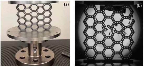(a) A 4 × 4 unit cell test structure affixed between the rigid plates of the Instron machine and (b) fracture of a 5 × 5 unit cell test structure under transversal compressive loading captured by a high-speed camera.