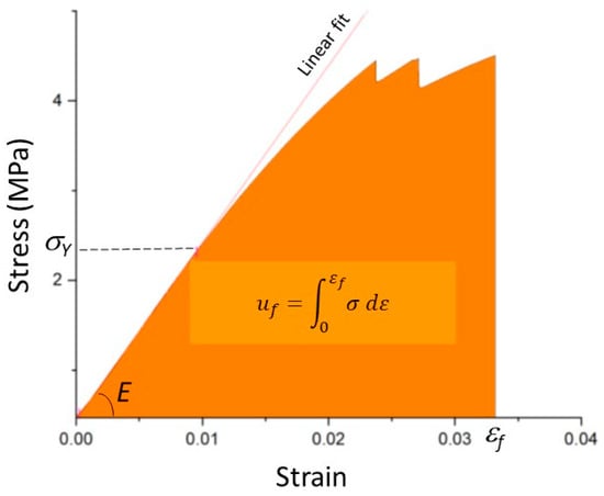 True stress–strain responses derived from the force–displacement data recorded during testing were used to extract the critical mechanical properties of each structure. Figure 3 displays a representative stress–strain response, including characteristic material properties, such as the elastic modulus E, yield strength σY, strain at fracture εf, and strain energy density at fracture uf. The elastic modulus was obtained by a linear fit through the stress–strain data of the elastic deformation range. The same method was used to calculate the elastic modulus from the FEM-simulated stress–strain response of each structure. The strain energy density was obtained as the area under the entire stress–strain response up to a specified strain (e.g., fracture strain εf). The stress drops in the stress–strain response shown in Figure 3 before the commencement of the massive failure were due to microfracture events, detected in the video recording of the high-speed camera.