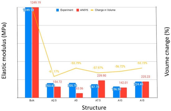 The experimental results of the elastic modulus were contrasted with the simulation results to confirm the validity of the FEM model. Figure 4 shows a fair agreement between the experimental and simulation results for structures A2.5, A7.5, A10, and A15. The discrepancy between the results for structure A5 could be attributed to the mesh coarseness. The comparison validated the modeling assumptions and discretization scheme. Figure 4 also shows the volume change (with respect to a solid (bulk) structure with the same dimensions) for each structure. Both the experimental and simulation results indicated that the bamboo-like structures were significantly more compliant and lighter than the bulk structure. From elastic stiffness and weight perspectives, A10 appeared to be the most compliant and lighter structure. Thus, from the lowest compliance standpoint, the critical unit cell and void sizes are predicted to be about 10 and 2 mm, respectively. The results shown in Figure 4 illuminate a size-dependent mechanical behavior and also demonstrate how biomimicry can be used to engineer the compliance-to-weight ratio of bioinspired engineering materials.