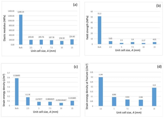 Figure 5 shows the effect of the unit cell size on the mechanical characteristics of the bamboo-like structures. The mechanical properties of the bulk material are also included for comparison. Because the structures failed at different fracture strains, the results of the strain energy density at a fixed strain (i.e., 0.028) are also included for comparison. The results indicated that structures A2.5 and A15 exhibited the highest elastic modulus, yield strength, strain energy density, and fracture strength. However, if the change in volume (weight) was also taken into consideration, A2.5 appeared to be the preferred structure among all tested structures. Thus, the critical unit cell and void sizes for high strength and toughness bamboo-like structures were estimated to be about 2.5 and 0.5 mm, respectively. The elastic modulus, yield strength, fracture strength, and strain energy at fracture (obtained as the area under the stress–strain response) versus the unit cell size and void size of the tested structures are given in Table 1.