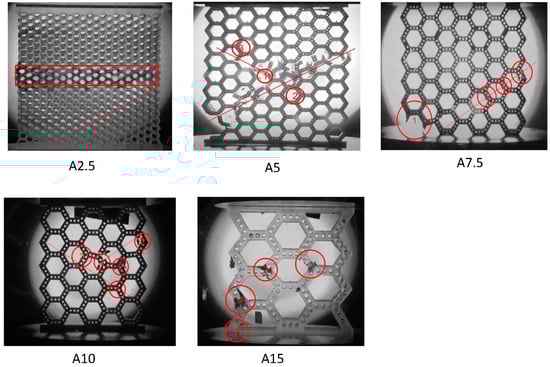 Further insight into the deformation behavior of the bamboo-like structures was obtained from the video recordings. Selected images of the failed structures are presented to provide insight into the failure process. Figure 6 shows characteristic images of the failed structures. The circled regions denote the fracture points, the circled numbers indicate the sequence of the fracture events, and the lines represent the final fracture path. Due to the small unit cells of structure A2.5, it was difficult to discern the failure process from the images of this structure. Nevertheless, the distortion of the unit cells revealed a failure path at a slope of ~30°. Moreover, due to the small thickness of the structure, localized out-of-plane bending of the middle sections of this structure (enclosed by a red square) was also detected at the instant of failure. Although cracking in structure A5 was instigated at the bottom left corner, presumably due to localized stress concentration, this crack had no obvious and direct implication on the final fracture that commenced in the central region of the structure. The fracture in structure A5 was found to be a multistep process. A microcrack formed first in the central region of this structure, specifically at the highly stressed corner of a unit cell and, subsequently, propagated along a ~30° sloped path almost instantaneously in both directions. Multiple fracturing events were observed as small downward excursions in the stress–strain response (Figure 3). Finally, a large stress excursion occurred in the stress–strain response at the instant of failure by fracture.