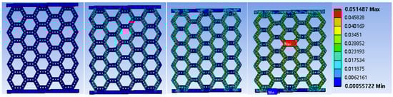 The FEM simulations provided an insight into the failure process of bamboo-like structures. It was found that the maximum stresses and strains occurred in the central region of the structures. As the deformation evolved, the highly stressed points aligned in a certain direction, closely resembling the fracture lines of the failed structures. The FEM animations revealed that larger stresses and strains developed at the corners of the hexagonal unit cells. A representative result of the progression of deformation in structure A10 is shown in Figure 7. The strain maps show that the highest strain eventually arose at the center of the structure (right panel), in qualitative agreement with the experimental observation of the crack initiation in the failed structures. Similar evidence was derived from the FEM simulations of other structures.