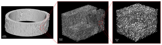 Three µCT 3D renderings at three magnifications: left: the whole matrix, middle: a large volume of interest (500 × 300 × 300 µm3), and right: a small volume of interest (100 × 100 × 100 µm3).