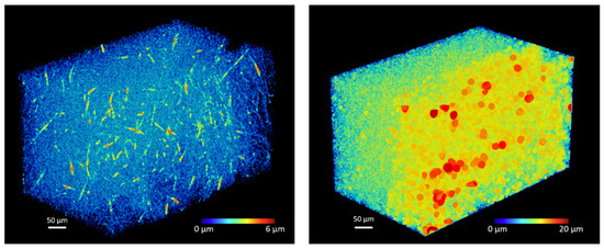 The diameter of the fibers was homogeneous throughout the volume, with only some isolated areas of large fibers of 6 µm (Figure 3 left). Conversely, the porosity was not homogeneously distributed over the thickness of the sample. Larger pores, from 15 to 20 µm in diameter, were observed in the outer half of the thickness of the sample whereas small pores, from 2 to 10 µm, were found through the inner part of the matrices (Figure 3 right).