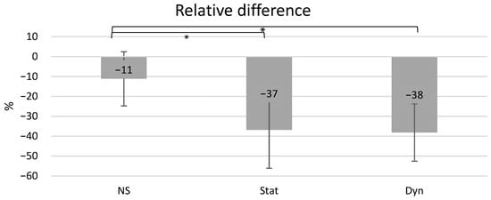 Averaged value of the stiffness relative differences for the NS (Non-seeded), Stat (static condition), and Dyn (dynamic conditions) obtained by analyzing nine samples (three matrices and three experimental campaigns) between d10 and d21. *: significantly different (p-value < 0.05).