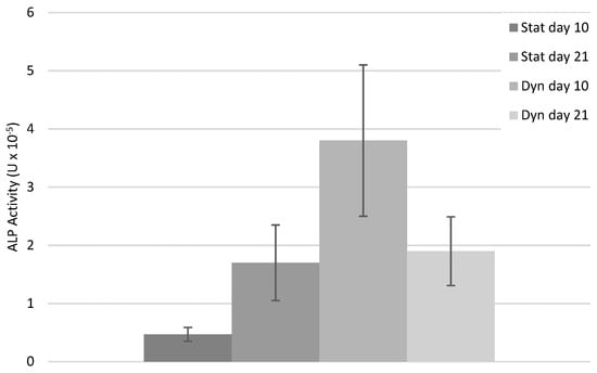 Regarding the ALP activity, the static group presented an increased tendency between days 10 and 21 while the opposite was found for the dynamic group. In addition, it was observed that the ALP activity for the static group appeared lower than the dynamic group at day 10, while at day 21, both groups presented a similar activity (Figure 6). The numerical values and the bar charts for each experimental series are shown in the Supplementary Materials (Table S2 and Figure S1, respectively).
