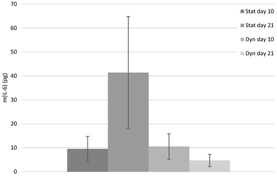 IL-6 amount (pg) averaged over the three series for the static and dynamic groups at days 10 and 21.