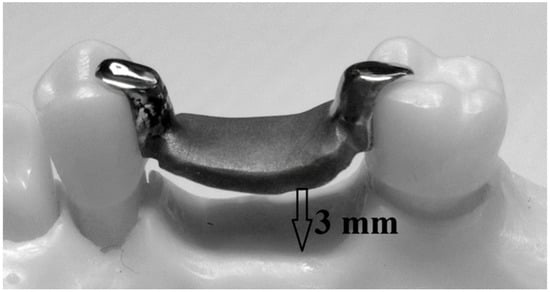 The RPD framework was designed using the digitally scanned model with the default thickness of the saddle and occlusal rests area (thicknesses 1.2 mm and occlusal rest thinness preparation 1.2 mm (distally for the first premolar and mesially for the second molar)) using Amman Girrback Ceramill 600 software. Moreover, a distance of approximately 3 mm was created between the saddle and the alveolar ridge to allow the universal testing machine crosshead to be generated when the load is applied (Figure 3). The designed RPD was milled into the wax using the CAM process (milling manufacturing). The wax crowns were then sprued, invested, cast, divested, finished and polished according to the manufactures instruction for BEGO (Wironit, Bremen, Germany) cobalt-chrome alloy materials. The RPDs were ready to be fitted into the crowns.