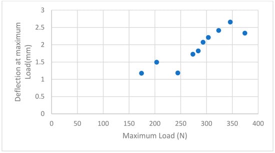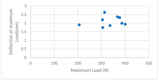For the RPD framework with the IPS e.max Press group, the maximum load was at 374 N with a maximum deflection of 2.3335 mm, while the minimum load was at 174 N with a minimum deflection of 1.1745 mm (Figure 7).